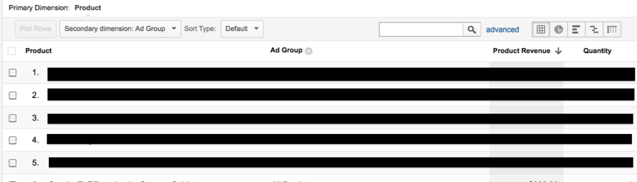 De GA report die ik het vaakst gebruik voor mijn PLA campagnes is het product report. Wanneer u uw campagnes heeft gesegmenteerd per product type (zoals we u hebben laten zien in andere delen van deze gids), dan kan het nuttig zijn om te weten welke producten eigenlijk worden gekocht in ieder segment. Natuurlijk kunt u zien welke zoekopdracht een klant heeft gezet tot een aankoop in uw AdWords interface-maar we weten allemaal dat niet iedereen koopt waar hij naar op zoek was!