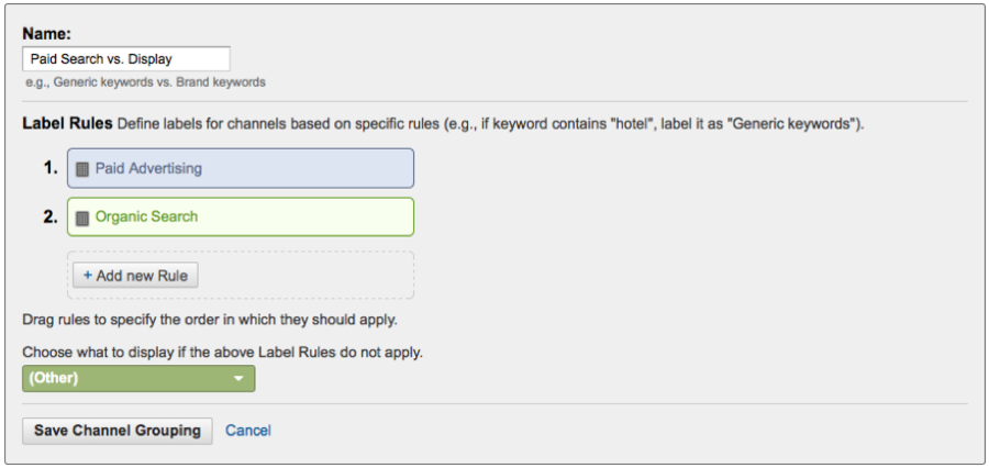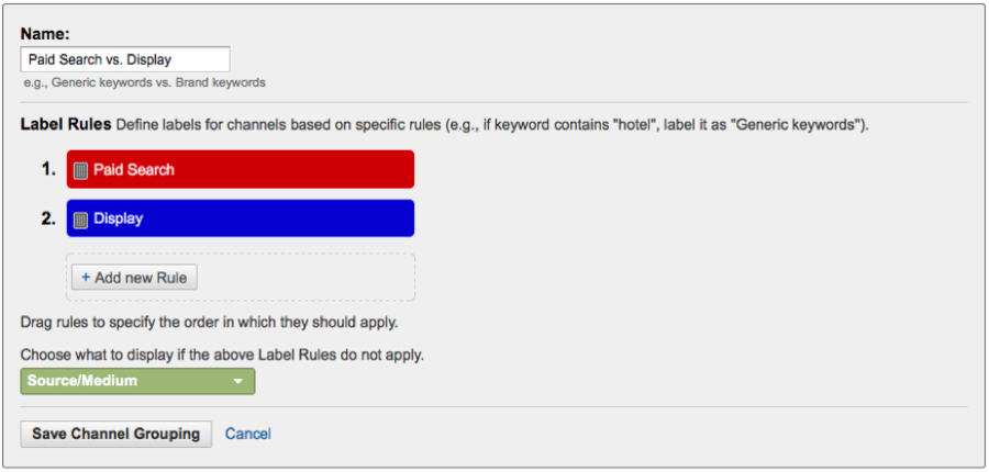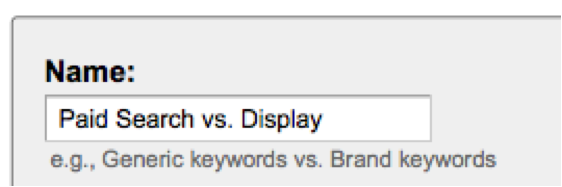 1.Benoem uw kanaal. Het eerste wat u wilt doen nu, is uw kanaal een naam geven. Omdat ik wil kijken naar de performance van betaalde zoekresultaten vs. display advertenties, noem ik mijn kanaal ‘Paid Search vs. Display’.