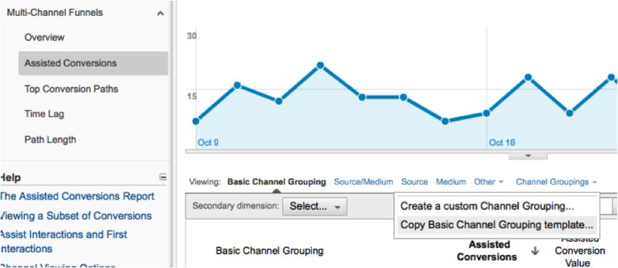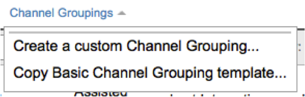 Elk van deze tags is gedefinieerd op dezelfde manier zoals u aangepaste filters in Analytics definieert. U kunt de parameters voor elk van deze tags zien door of op het Assisted Conversions of op het Top Conversions rapport te klikken. Klik op het Channel Groupings drop down en selecteer ‘Copy Basic Channel Grouping template…’.