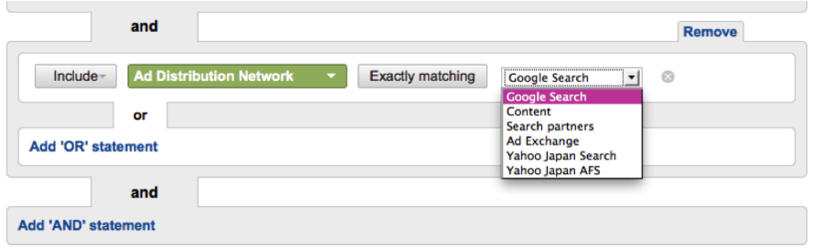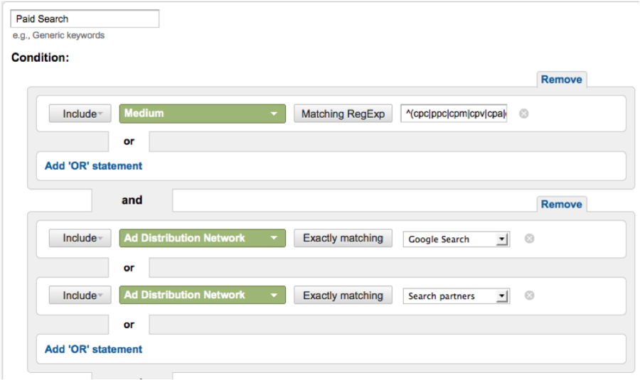 Omdat ik wil dat deze tag verkeer laat zien die kwam van zowel het betaald en het zoek netwerk, moet ik een AND verklaring toevoegen.