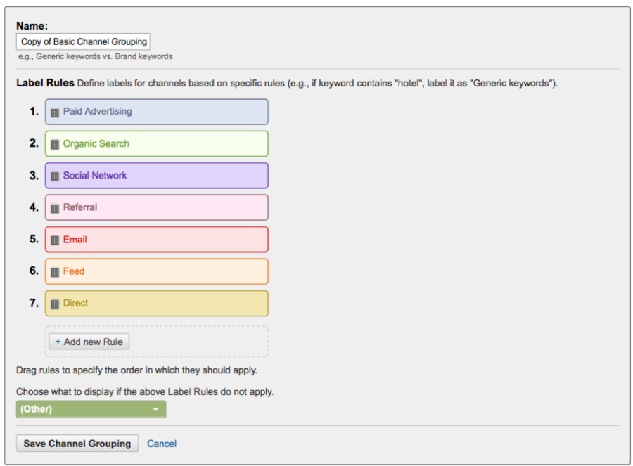 Ook al geeft de basis kanaal groepering een hoop inzicht, het kan toch zijn dat u uw eigen kanaal groepering wilt maken gebaseerd op de kanalen die u wilt analyseren in uw rapport. U kunt momenteel tot 25 aangepaste kanalen maken per Analytics profiel.