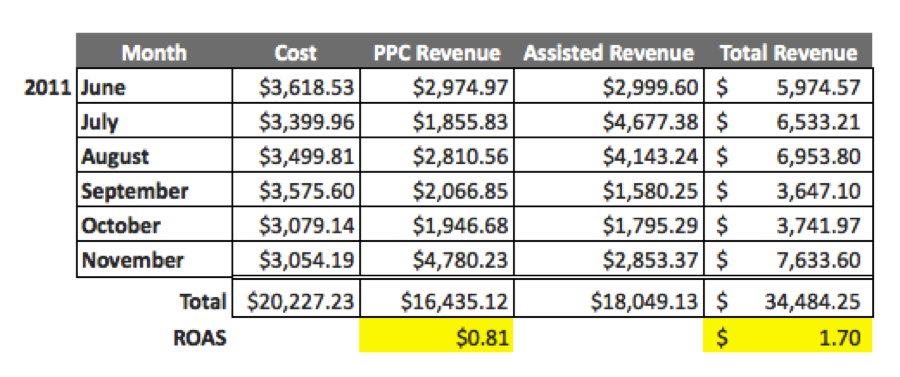 Voor MCF konden we alleen omzet rapporteren die kwam van de laatste klik PPC conversie. Puur gebaseerd op deze data was dit account geld aan het verliezen. Voor iedere dollar uitgegeven aan advertenties, werd slechts $0.81 omzet gegenereerd. Geassisteerde PPC omzet inbegrepen, wat meer dan de helft van de gegenereerde omzet was in de laatste 6 maanden, nam ROAS toe tot $1.70.