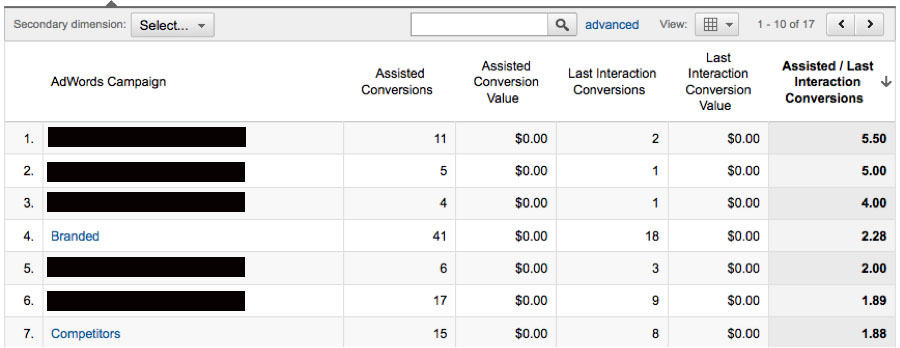 Ga naar het Assisted Conversions rapport en navigeer naar het AdWords tabblad. Sorteer uw gegevens op Assisted/Last Interaction Conversions om de campagnes weer te geven die u waarschijnlijk onderschat.