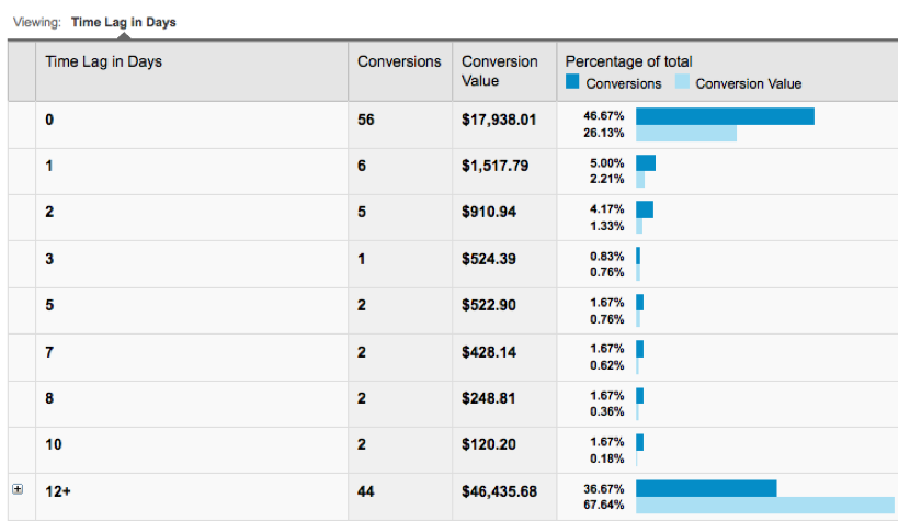 In het voorbeeld hierbeneden van een e-commerce klant was de helft van het aantal conversies inde eerste dag, maar meer dan 30% had 12 dagen of langer nodig. Ook waren deze conversies met een langere tijdspanne veel waardevoller omdat ze zo’n 68% van de omzet genereerden.