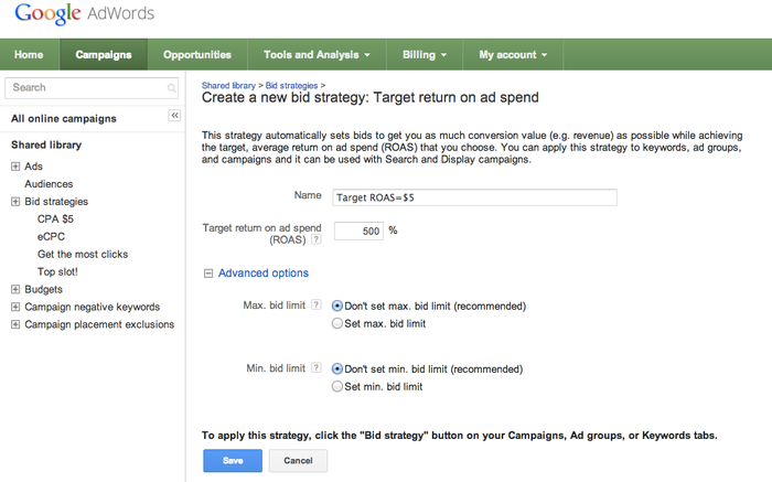 - Shared Library > Bid Strategies > Maak een “New Target ROAS” - zie de afbeelding hier beneden.
