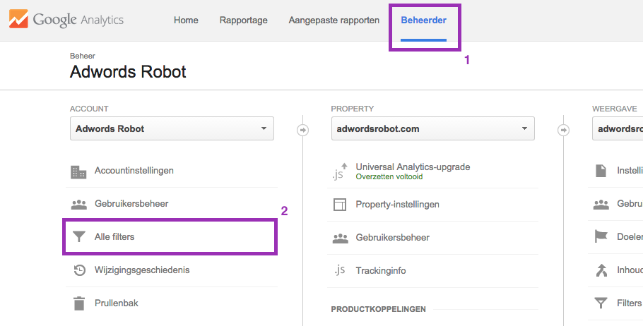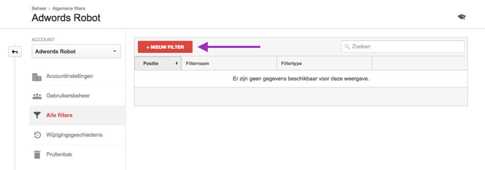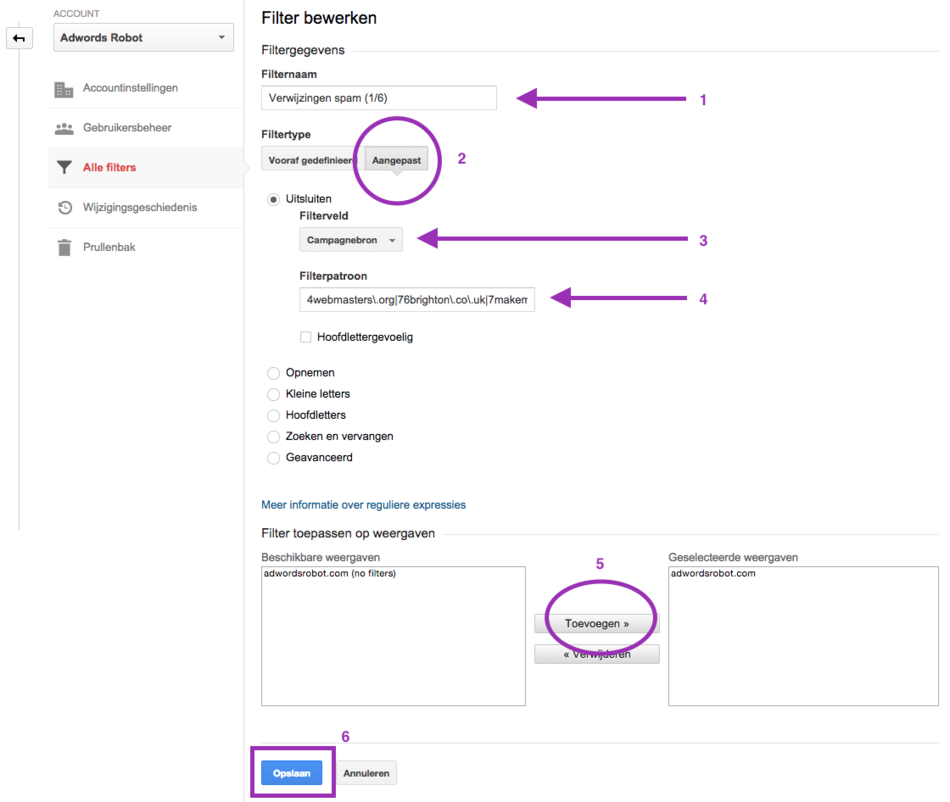 Nu kun je Filters instellen die de spam zullen uitsluiten. Dat gebeurt op basis van de verwijzingsbron.