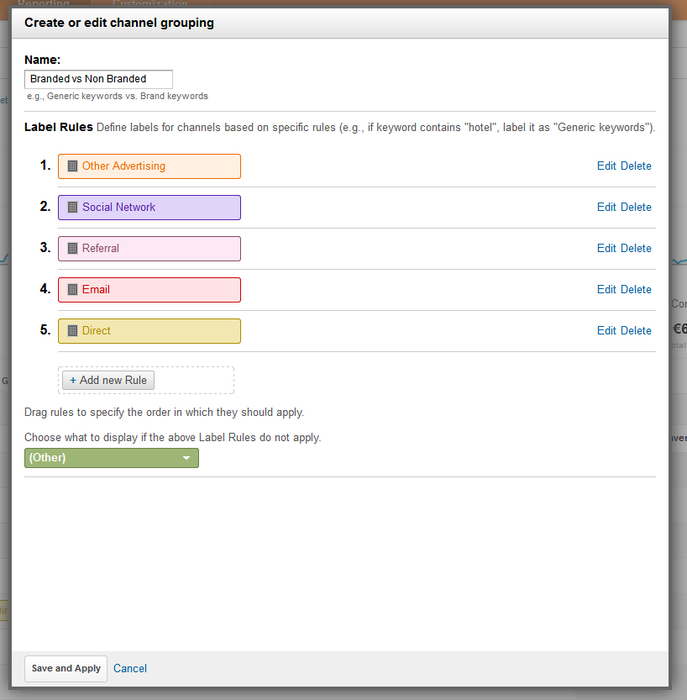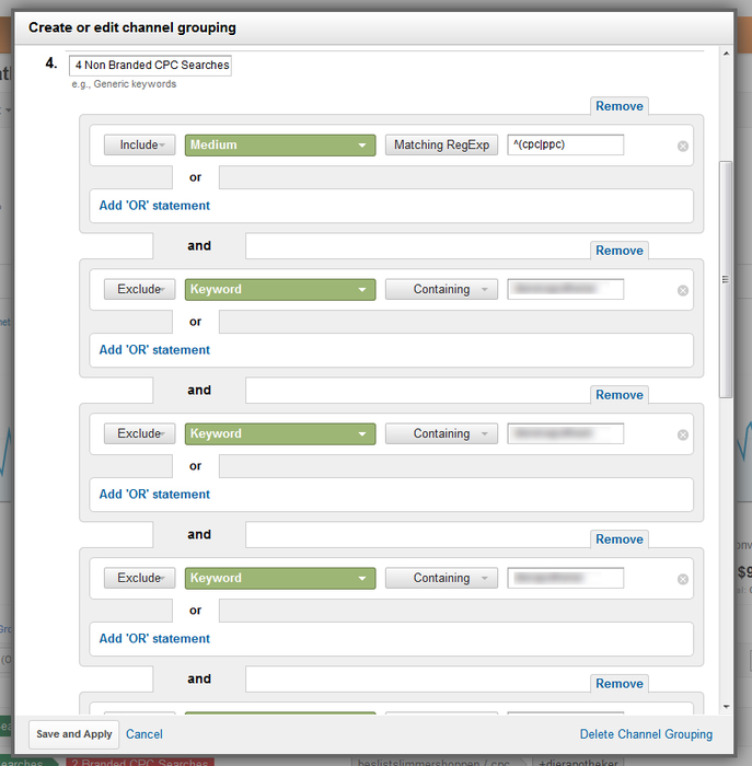 Nu gaan we met de zgn. “Channel Grouping” spelen. De voorinstelling is namelijk te grof voor ons probleem. We willen graag een onderverdeling in “Branded PPC Searches”, “Non Branded PPC Searches”, “Branded Organic Searches” en “Non-Branded Organic Searches”. Door deze Channels aan te maken en vervolgens met een filter de juiste channel-volgorde te specificeren hebben we het rapport dat we zoeken.