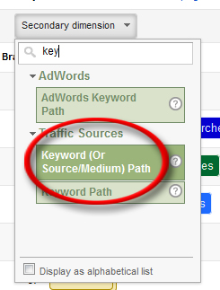 Zet eerst de “Secondary dimension” op “Keyword (Or Source/Medium) Path”. Zo krijgen we in hetzelfde overzicht informatie over de gebruikte keywords.