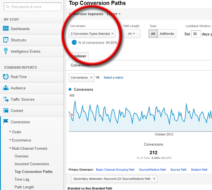Ga in het linker menu naar tabblad “Conversions” -> “Multi-Channel Funnels” -> “Top Conversion Paths”. In dit venster kunnen we met enig werk het bovenstaand scenario specificeren en de bijhorende omzet bepalen. Allereerst moet het conversietype ingesteld worden. Zorg dat alleen de conversies geselecteerd zijn die ook via Adwords geregistreerd worden, dus bijvoorbeeld de aankoop van een boormachine.