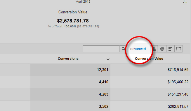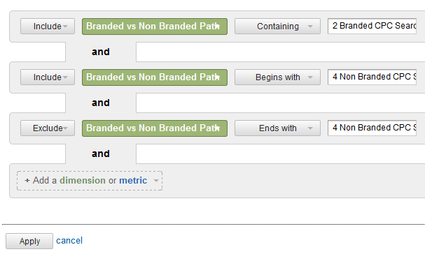 We houden nu dus alleen de gegevens over van mensen die ten minste één keer op een branded ppc advertentie geklikt hebben, die als eerste interactie op een non-branded ppc advertentie geklikt hebben en niet als laatste op een non-branded ppc advertentie geklikt hebben (deze conversies zijn tenslotte volgens het last-click principe bij de non-branded campagne gerekend). Klik op Apply.