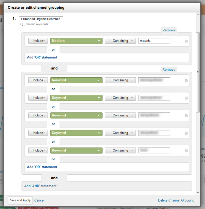 We gaan eerst de groep “Branded Organic Searches” aanmaken. Het is handig de titels van onze zelfgemaakte groepen te nummeren aangezien ze dan makkelijker te filteren zijn. Geef deze groep de titel “1 Branded Organic Searches” en geef de eerste voorwaarde in zoals in de afbeelding: “Include medium containing organic”. Klik op “Add ‘AND’ statement en voer de volgende voorwaarde in: “Include Keyword Containing [bedrijfs/merknaam]”. (Vul voor [bedrijfs/merknaam] uw bedrijfs of merknaam in!) Indien uw merknaam op meerdere manieren geschreven kan worden, of er vaak typfouten gemaakt worden kunt u al deze varianten toevoegen met “OR” statements. In mijn geval heb ik vijf verschillende varianten ingevoerd. Geef de groep een kleurtje en klik op save.