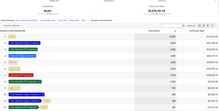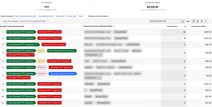 Hieruit volgt een ROI van 6.98 voor Non-Branded Keywords en 43.19 voor Branded Keywords. We gaan nu uitzoeken hoe groot het gedeelte van de omzet is wat voort komt uit bovenstaand scenario. Dus een klant die eerst op een non-branded advertentie klikt, vervolgens andere handelingen onderneemt, op een branded advertentie klikt en dan converteert.