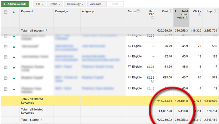 Bovenaan de pagina staat de totale omzet van dit rapport: “€ 9239,60”. Dit is dus de omzet die van de branded campagne overgezet moet worden naar de non-branded campagne. De gemaakte kosten blijven uiteraard gelijk. De nieuwe gegevens zijn dan: