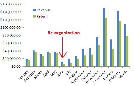 Om naar het totale plaatje te kijken, herhaal dit proces voor het leven van het account. Trek deze keer rapporten op account niveau terug naar het begin van het account, verdeeld per maand. Importeer de data in Excel, sorteer op maand, oudste naar nieuwste. Daarna maak een nieuwe kolom met de formule voor het gemiddelde van de vorige 12 maanden data met ieder data punt dat u wilt vastleggen in een grafiek. Maak lijngrafieken van deze data, en u ziet de maandelijkse performance trends voor het leven van het account. Het gemiddelde verwijdert irrelevante schommelingen zoals vakantiemaanden en niet-e-commerce sites, en helpt u negatieve of positieve trends van de voorgaande accountmanager te onderscheiden.