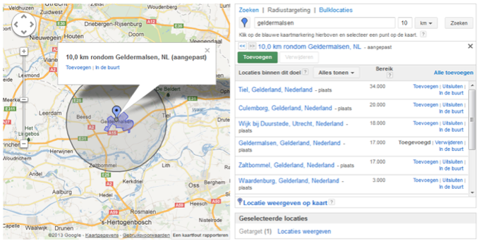 Ook dit is mogelijk! Het grote voordeel is het verhogen van je naamsbekendheid in je eigen regio, door middel van je advertenties op de websites die aangesloten zijn bij het Display Netwerk van Google. Er zijn meerdere redenen om te kiezen voor regionaal adverteren ten opzichte van adverteren in heel Nederland, Europa of wereldwijd. Met de geografische targeting opties van Google kunnen advertenties zeer gericht geplaatst worden op bijvoorbeeld postcode, plaatsnaam of regio. Er is zelfs een handige radius targeting optie waarmee een straal kan worden ingesteld rondom het gekozen gebied.