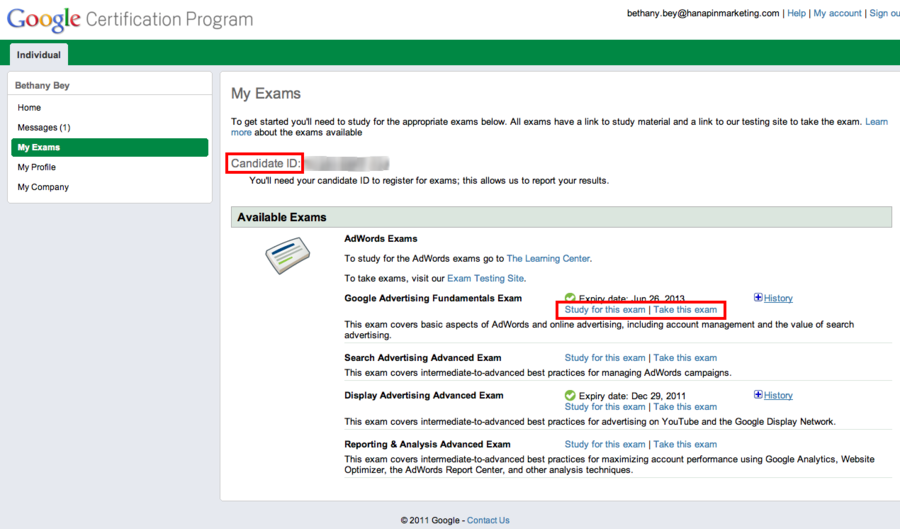 Om toegang te krijgen tot het Fundamentals examen moet u eerst een Google Certification Program profiel aanmaken. Als u bent ingelogd kunt u klikken op ‘My Exams’. Vanaf hier kunt u direct naar het Fundamentals examen en de geavanceerde examens door te klikken op ‘Take this exam’. Noteer uw Candidate ID want u heeft dat nummer nodig om voor het examen te registreren.