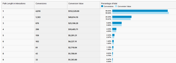 Hier kunt u uitzoeken hoe vaak uw klanten via één of meer kanalen binnenkomen voor er geconverteerd wordt. Meer interacties duiden op een langere “sales cycle”. Indien veelal slechts één interactie nodig is heeft u te maken met impulsaankopen.