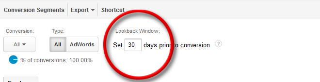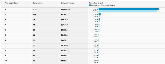 Hier wordt weergegeven of uw klanten binnen één dag of over een langere periode converteren. Indien een substantieel deel van uw conversies pas na meerdere dagen gebeuren, betekend dit dat uw klanten meer tijd nodig hebben om te vergelijken en te oriënteren. Blijkbaar wordt er veel getwijfeld! Hier kan op ingespeeld worden met bijvoorbeeld remarketing. Indien nodig kan de lookback window worden vergroot tot 90 dagen.