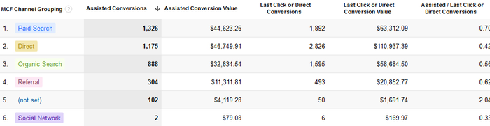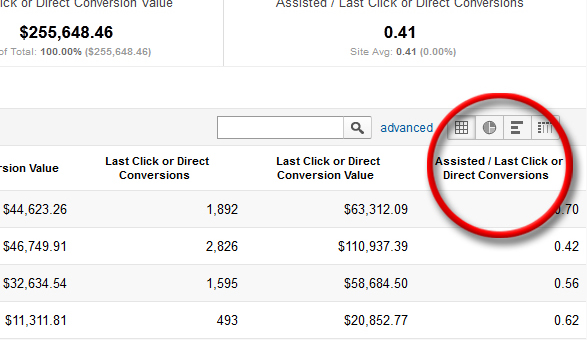 Hier worden de marketing kanalen op een rijtje gezet met de bijhorende omzet waarden. Persoonlijk vind ik de manier waarop deze bedragen worden berekend een beetje moeilijk navolgbaar maar er is wel een leuke ratio te vinden in deze lijst: “Assisted / Last Click” helemaal rechts.
