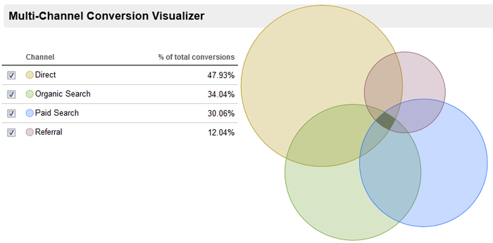 Het overview tabblad is een handige, zeer visuele manier om snel in te zien hoe uw marketing kanalen samenwerken bij het genereren van conversies. De cirkels geven percentages weer van het totaal aantal conversies. Waar deze cirkels overlappen zijn meerdere kanalen in samenwerking geweest om tot conversies te komen.