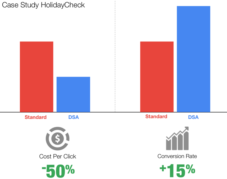HolidayCheck is een Duitse website die vakantiegelegenheden reviewt. Door het gebruik van Dynamic Search Ads hebben ze hun conversie’s en verkoopgetallen zien groeien met 15%. Daarboven hebben ze een 50% lagere cost per click vergeleken met de rest van de keyword portfolio’s. [case study]