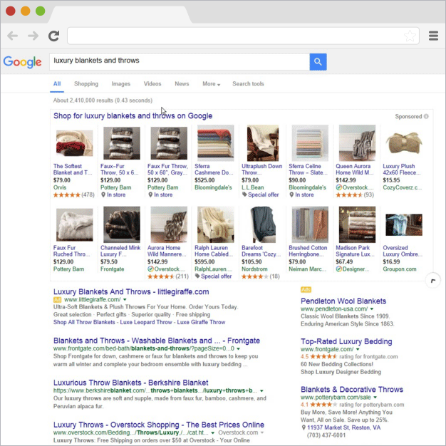 Bij het zoeken naar een product komen er tussen 4 en 16 producten bij de zoekresultaten. Deze shopping resultaten staan normaal gesproken boven de de tekstadvertenties en zijn daarom goed zichtbaar. Ook zie je de productfoto en de prijs met evt. beoordeling van de winkel, of het product afgeprijsd is, naam van de winkel, e.d.