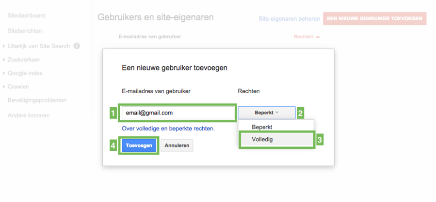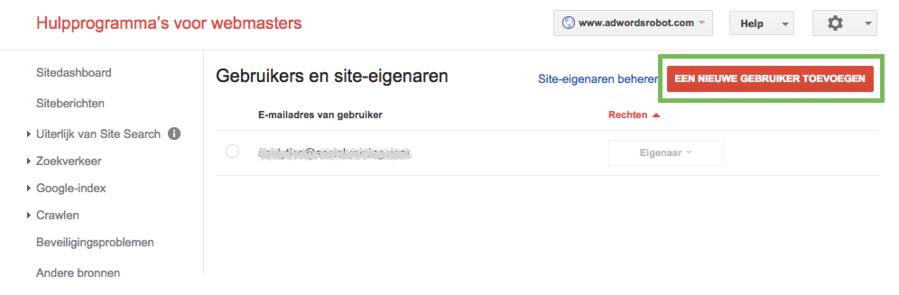 Gebruikers met volledige rechten kunnen alle gegevens bekijken en meeste acties uitvoeren, zoals het wijzigen van site-instellingen of het verlagen van sitelinks. Gebruikers met beperkte rechten kunnen de meeste gegevens bekijken en kunnen bepaalde acties uitvoeren (zoals Fetchen als Googlebot en het doorsturen van berichten configureren). Als u aan iemand volledige controle over de site wilt verlenen (en u zelf de site-eigenaar bent), kunt u de gebruiker toevoegen als eigenaar. Weet u het niet zeker? Meer informatie over rechten in Webmasterhulpprogramma's van Google.