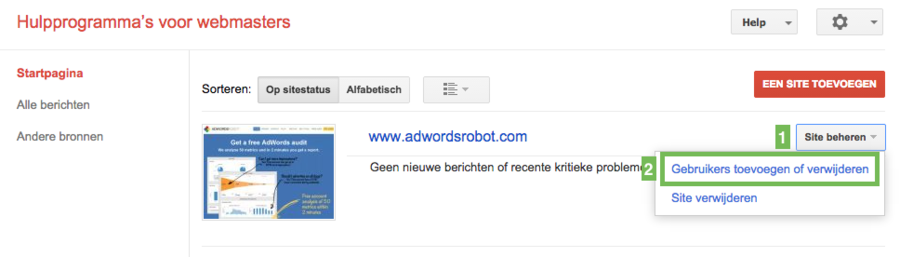 Zoek de gewenste website in de lijst. Klik op het Site beheren en selecteer op Gebruikers toevoegen of verwijderen.