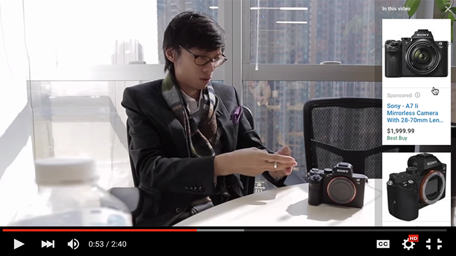 Hieronder zien wij directe shopping resultaten binnen een YouTube video die over een Sony camera gaat. Als iemand geïnteresseerd is in een product en zoekt op YouTube daar informatie over, kunt u deze persoon direct benaderen via een Shopping advertentie.